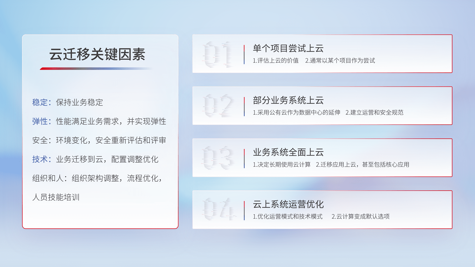 结合实际业务,,,,从规划设计、、、云平台选型、、、云原生改造、、数据迁移、、集成交付,,迁移全过程为客户识别最佳上云路径,,做好风险识别管理,,,,设计网络架构、、身份权限、、、安全审计合规、、、、操作审计、、、日志审计、、、监控告警策略、、、多站点容灾设计等,,对云上基础设施进行整体规划,,,,提升IT治理水平,,以满足弹性、、、、高可用、、高性能的需求。。。